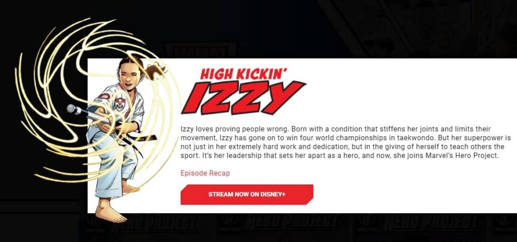 One episode of Marvel’s Hero Project featured Izzy, a 13-year-old taekwondo champion, who was born with arthrogryposis. Arthrogryposis causes the joints to become locked in a fixed position, and Izzy’s legs and hands were most affected, and when she was younger, she wore leg casts. Through having an active lifestyle and a keen interest in taekwondo thanks in large part to watching her sister, Izzy learned to work with her disability.